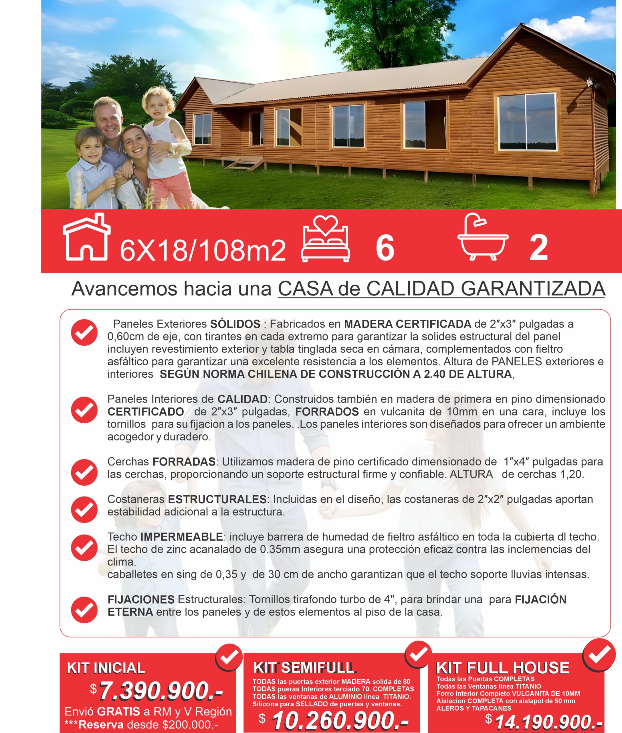 🏠 Casa prefabricada 6x18m (108m²) de madera certificada, con 6 dormitorios y 2 baños. Construcción sólida, térmica e impermeable bajo norma chilena. Ideal para familias grandes. Disponible en kits Inicial, Semifull y Full House. ¡Calidad garantizada y envío gratis!