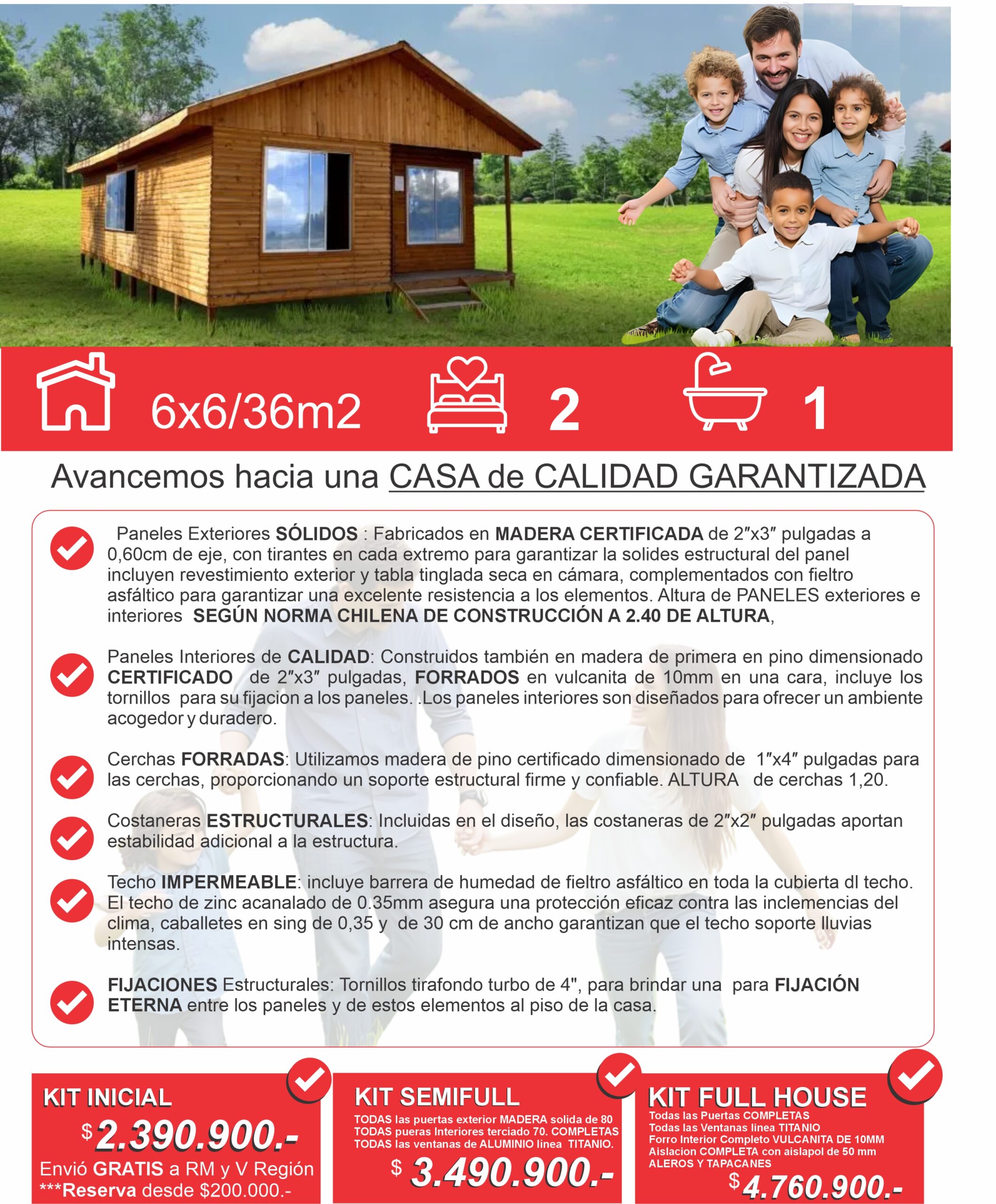 🏡 Casa prefabricada 6x6m (36m²) de madera certificada, con 2 dormitorios y 1 baño. Diseño resistente, térmico e impermeable, fabricado según norma chilena de construcción. Disponible en kits Inicial, Semifull y Full House. ¡Calidad garantizada y envío gratis!