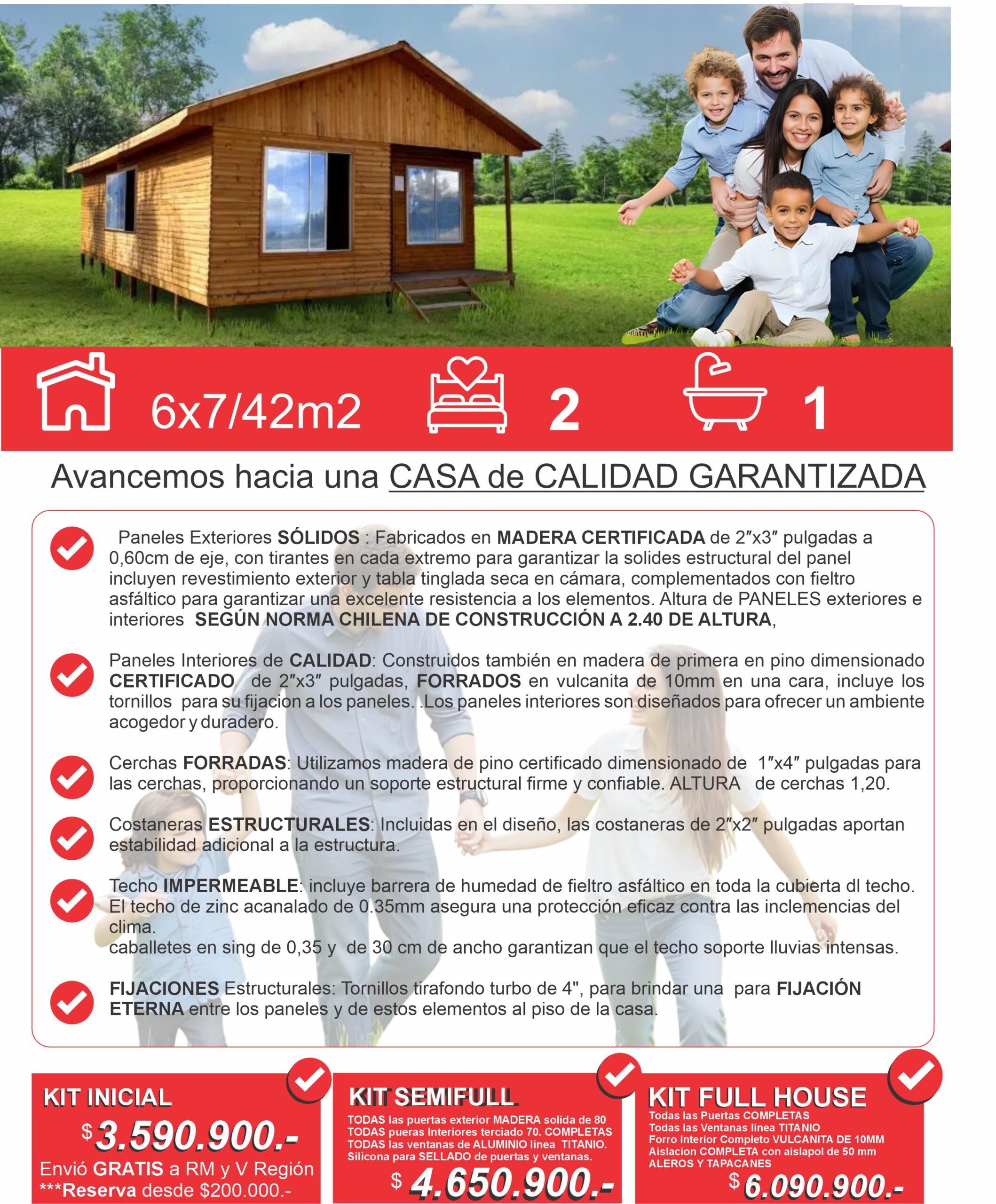 Casa prefabricada 6×7 m (42 m²) con 2 dormitorios y 1 baño. Construcción sólida en madera certificada, paneles exteriores e interiores de alta calidad, aislación térmica y techo impermeable con zinc 0.35 mm. Diseño moderno, eficiente y duradero según Norma Chilena de Construcción. Disponible en kits: Inicial, Semifull y Full House.
