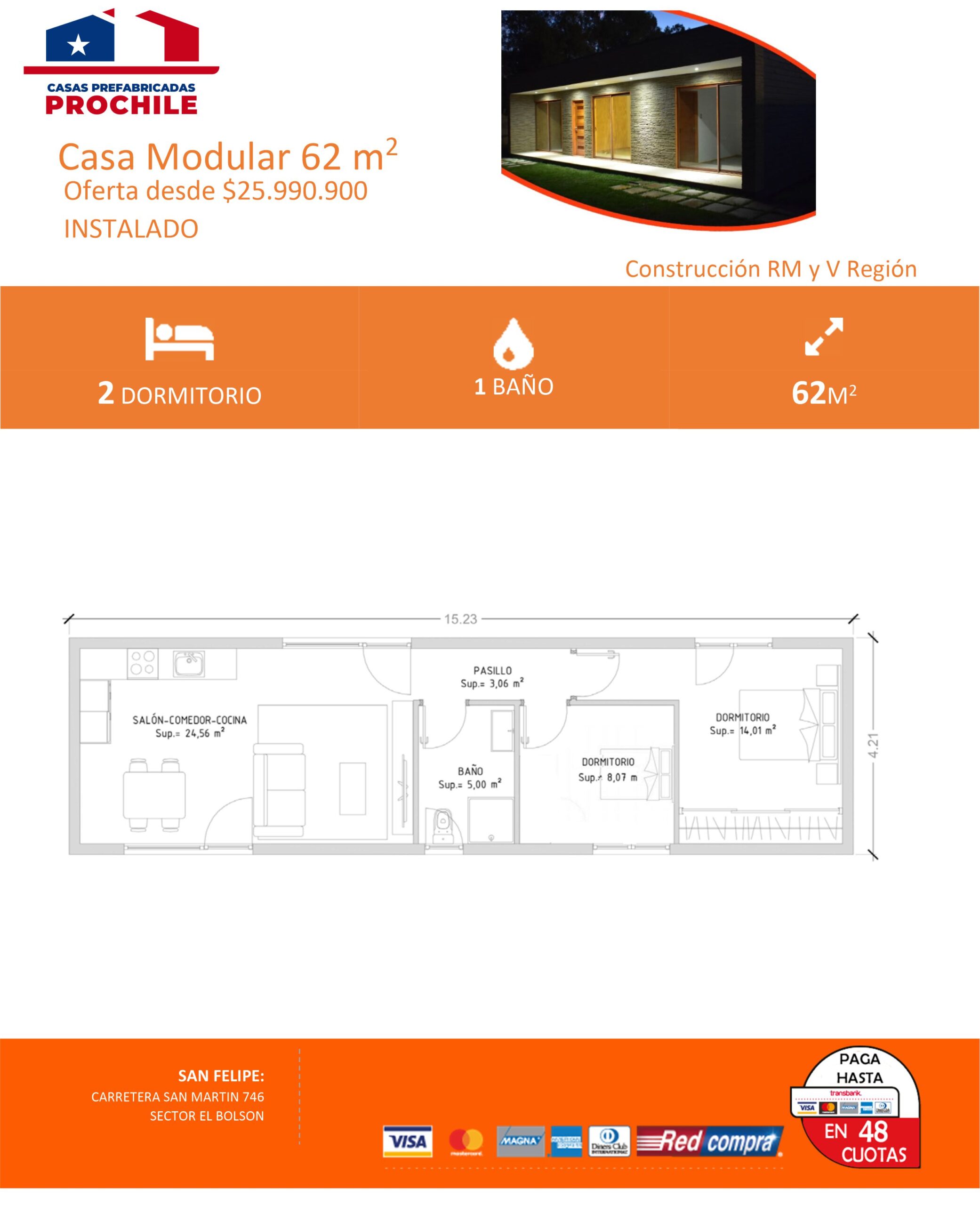 La Casa Modular 62 m² de PROCHILE es una vivienda de la línea Premium, diseñada para ofrecer amplitud, confort y eficiencia energética. Ideal para familias o parejas que buscan una casa moderna, funcional y de rápida instalación, con terminaciones de alta calidad y estructura modular durable.